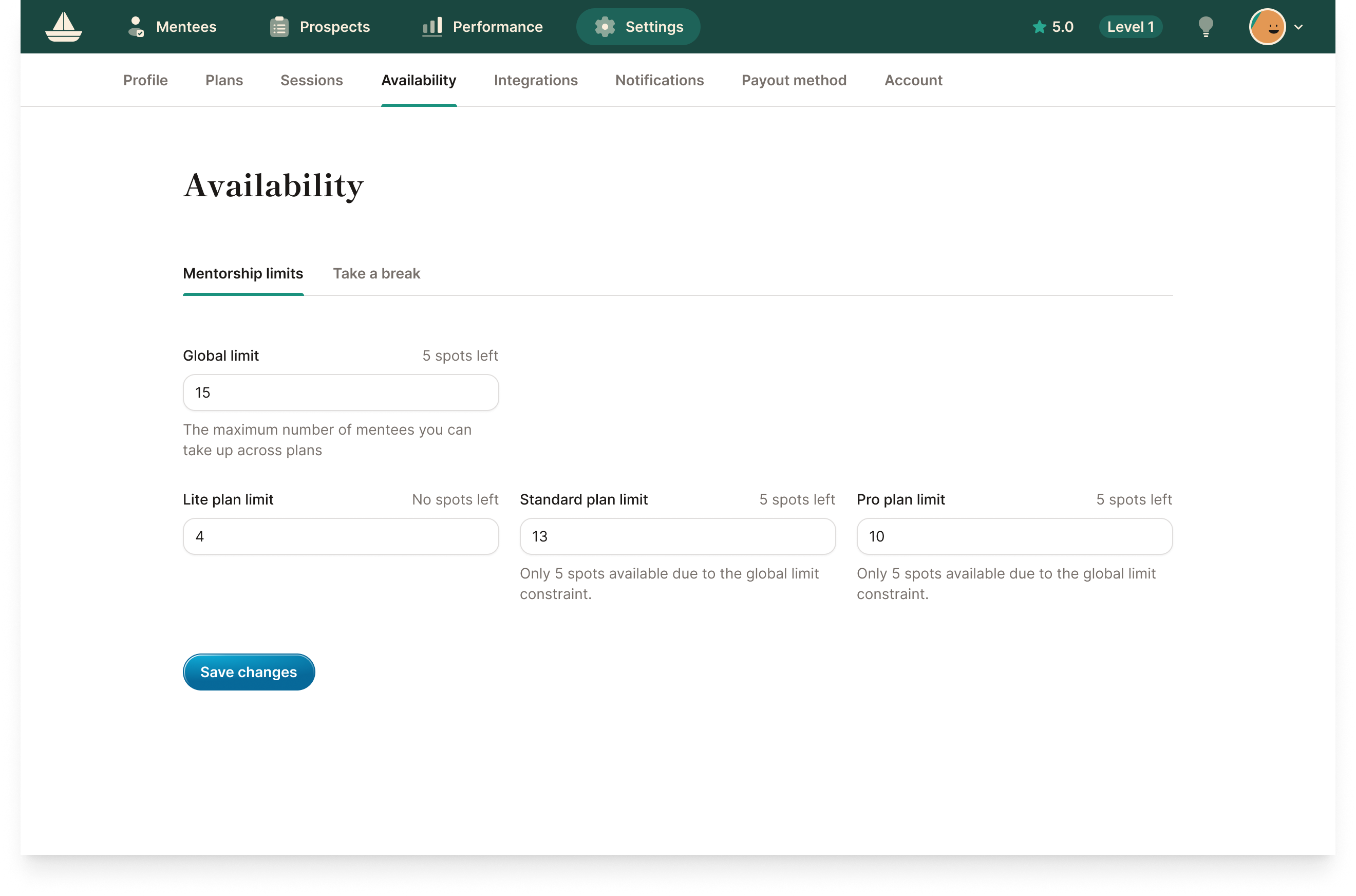 Mentorship limits is where you control how many mentees you can take on for each mentorship plan. We've moved it from Settings > Plans to Settings > Availability, and made some adjustments to the Global limit field:
