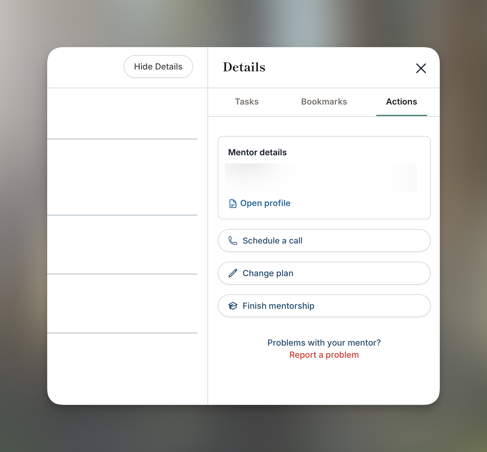 You can change your pricing plan directly from the dashboard view with your mentor. To do so, open the details pane, go to "Actions", then "Change plan".