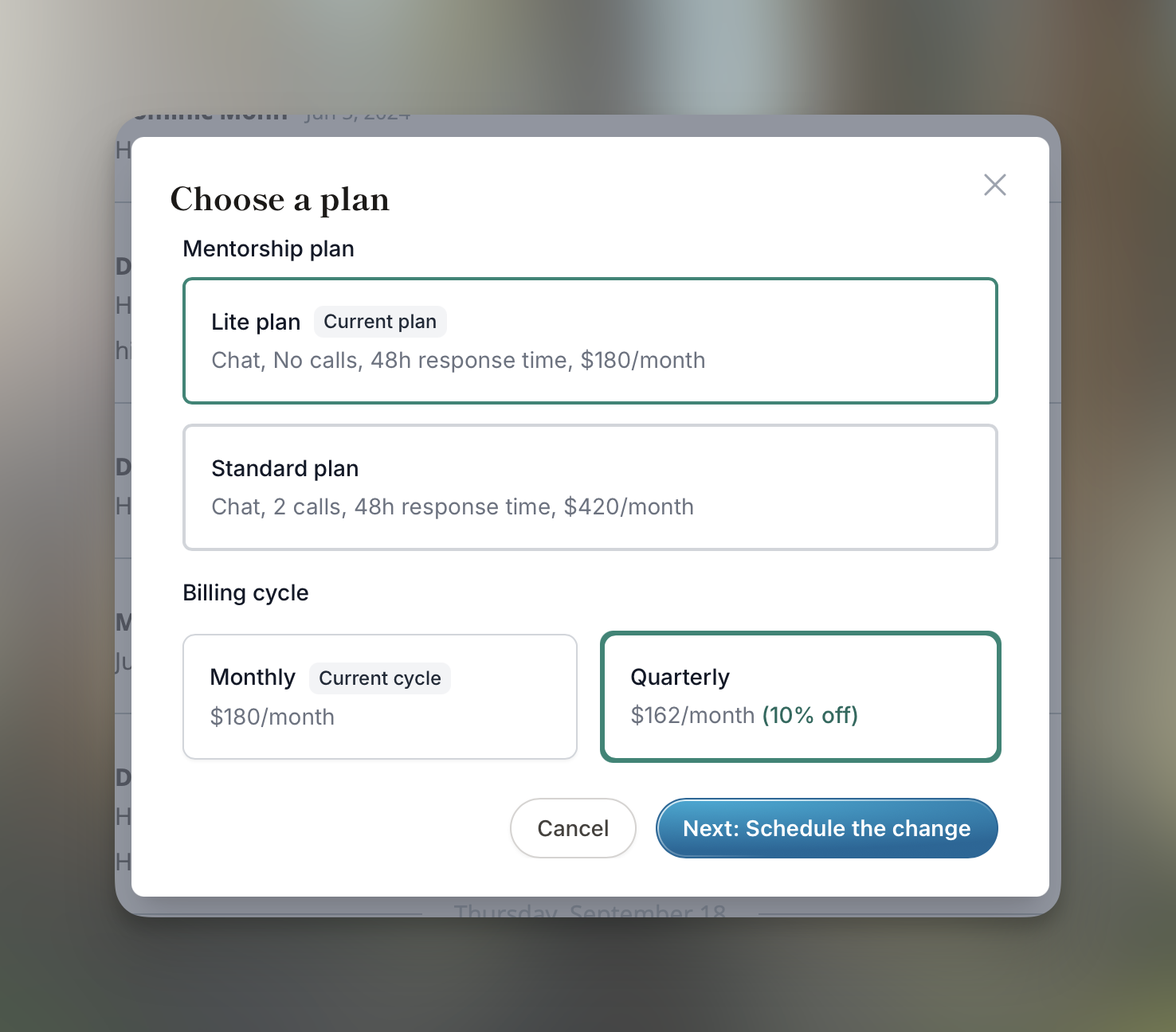 Additionally to the plan itself, you can decide the billing cycle on certain plans. This setting is at the discretion of your mentor – inquire with them if it's not available.
