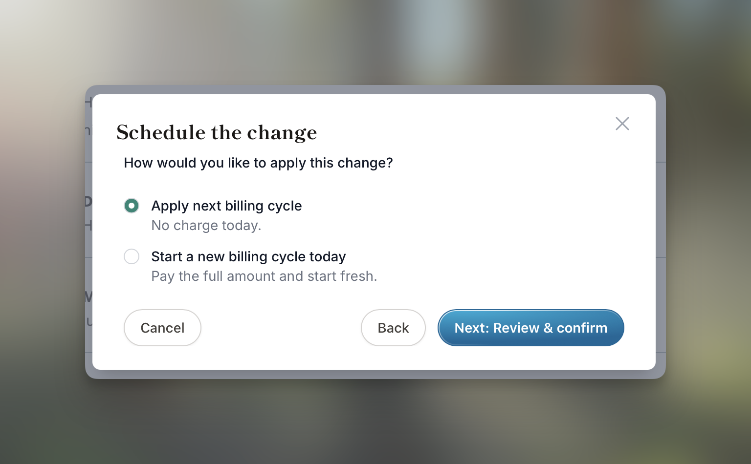 In the last step, you'll be able to schedule the changes either for next billing cycle, or starting the new billing cycle right away.